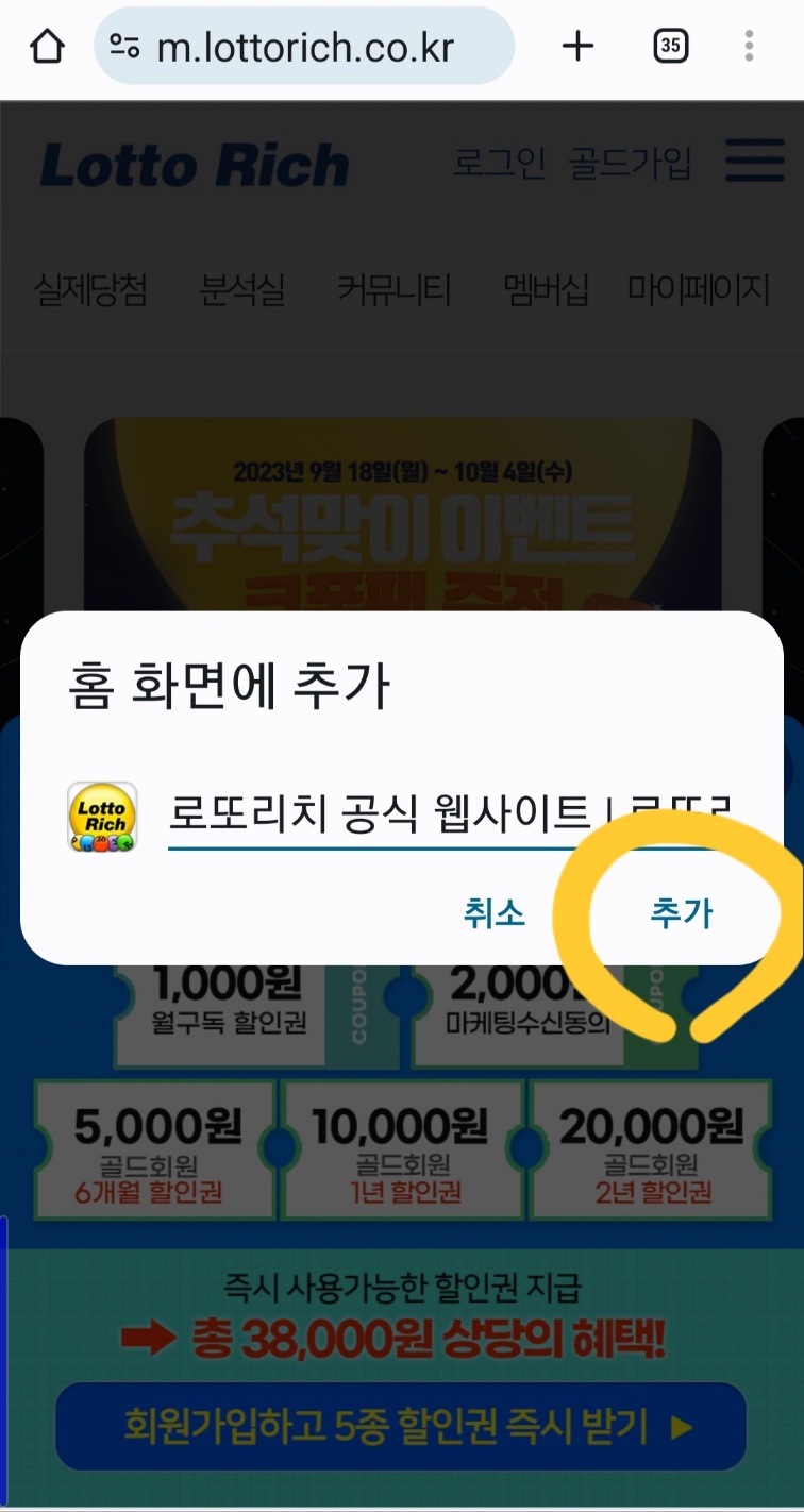 찾으신 로또리치모바일 바로가기 아이콘을 클릭해주셔서 맞게 들어가는지 확인하시면 됩니다. 이렇게 바로 어플 들어가듯이 들어가시면 일일이 검색 사이트가셔서 검색 안하셔도 바로 들어 가실 수 있으니 편리하게 사용하실 수 있습니다.