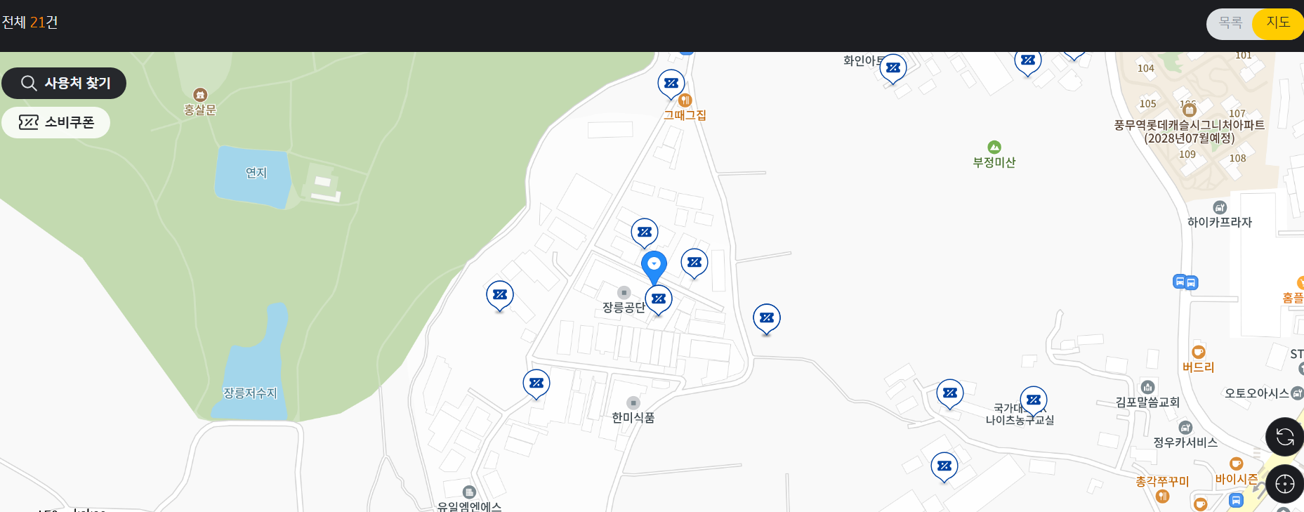 만약에 다른 지역으로 살펴보고 싶으시다면 다른지역으로 위치를 옮기신 후에 다시 아래 오른 쪽에 보시면 새로고침 아이콘이 있어요 새로고침 하시면 원하시는 지역의 사용처를 아실 수 있답니다.