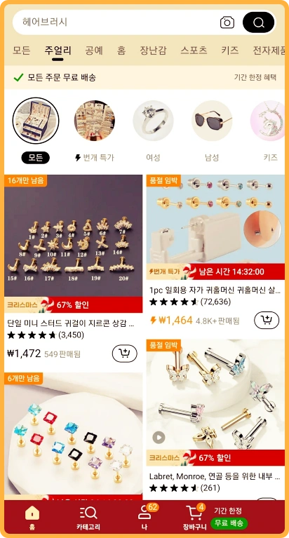 한국에서 배송되는 셀프 피어싱 기기를 구매하려니 아니 가격이 4배가 되어 한번 구매해보자는 생각으로 TEMU 첫구매를 하게 되었습니다. 귀걸이 가격들도 너무나 쌉니다.