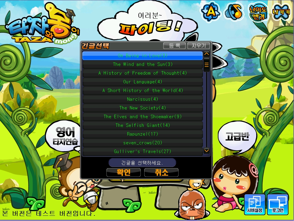 아래사진과 같이 단계별로 선택 할 수 있으며 영어버전, 한글 버전으로 구분해서 연습가능하며 사운드 조절, 난이도 조절도 가능합니다.