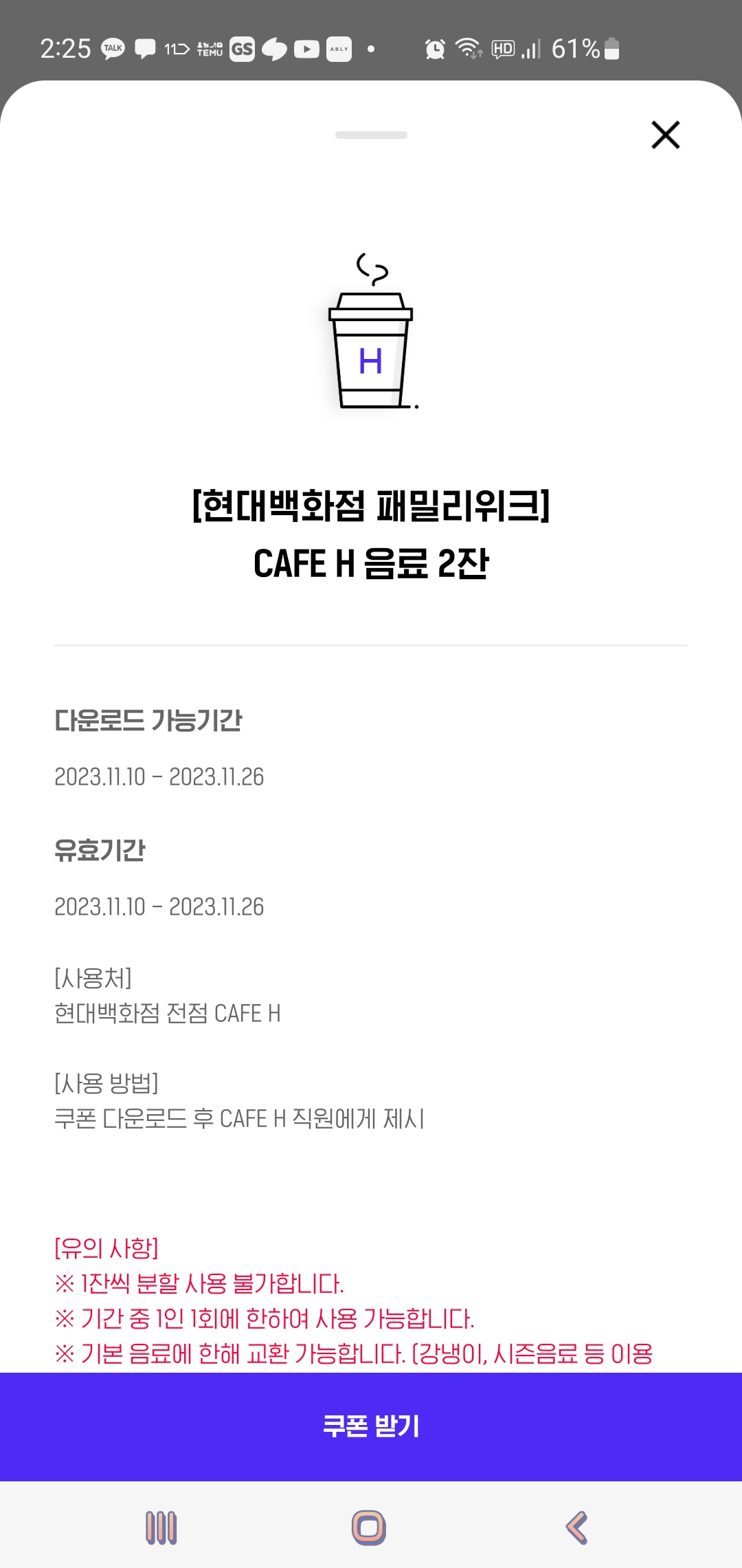 현대백화점 카페h 무료 음료 쿠폰현대백화점 카페h 무료 음료 쿠폰 다운로드