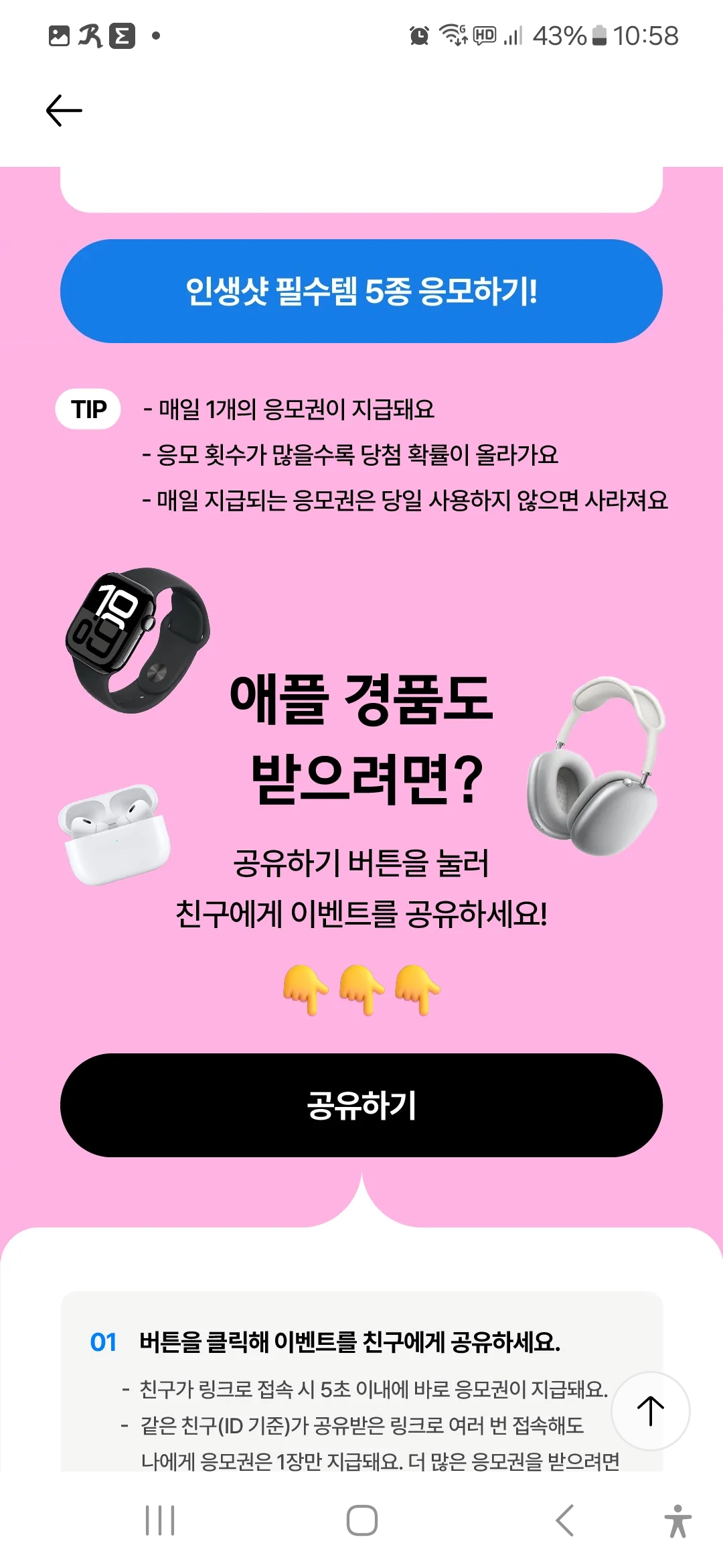카테고리 없음 화해 친구 응모권 롬앤 키트, 애플, 5000 by 뚜지 2025. 6. 7. 반응형 롬앤 인생샷키트, 애플경품, 5000포인트응모는 언제나 가능해! 화해 이벤트에 참여해 볼래요?https://hwahae.onelink.me/8Yb2/xyfxzom3 반응형 공유하기 게시글 관리 일일백가지 지식 "이 포스팅은 쿠팡 파트너스 활동의 일환으로, 이에 따른 일정액의 수수료를 제공받습니다."