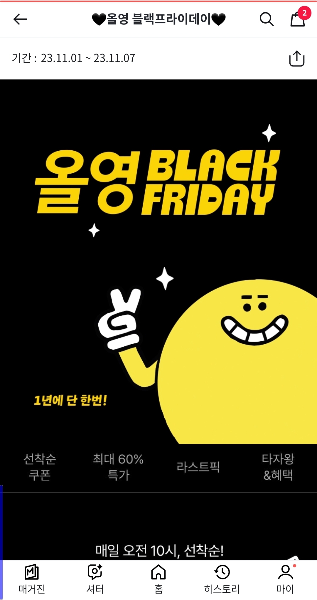 올리브영이 11월 1일 부터 11월7일까지 7일간 블랙프라이데이 할인이 시작되었습니다. 화장품이 필요한 분들은 모두모두 나오셔요. 최대 60% 할인 합니다.