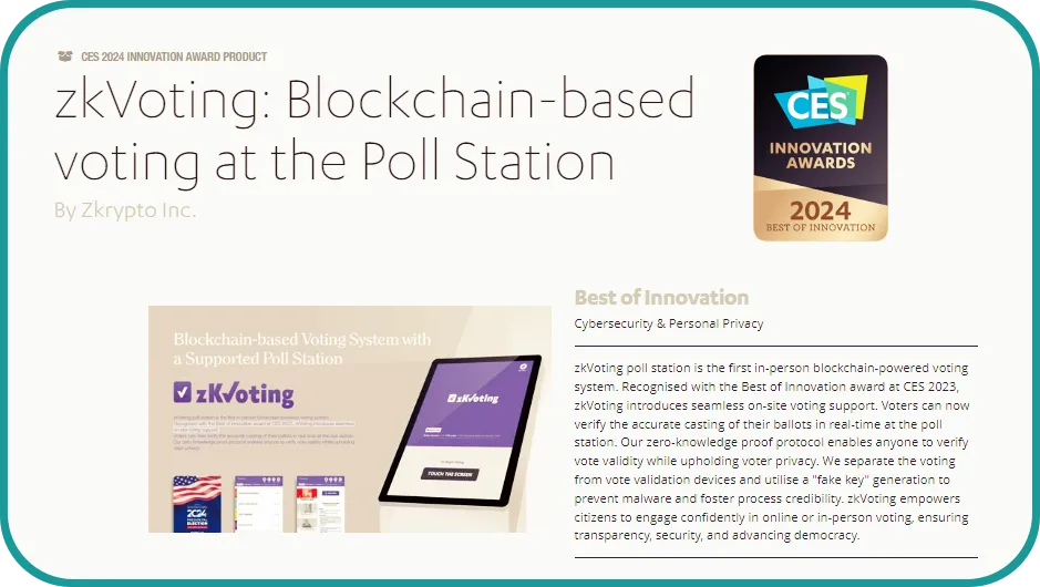 국내 볼록체인 프라이버시 보장기술기업인 Zkrypto의 자체 ZKP(Zero Knowledge Proof, 영지식증명) 기술을 이용해 원활한 현장투표와 실시간으로 정확한 투표용지 기표를 확인할 수 있는 볼록체인 투표 플랫폼 애플리케이션을 선보이면서 사이버보안과 사생활 보호부문 최고혁신상을 수상하였습니다.